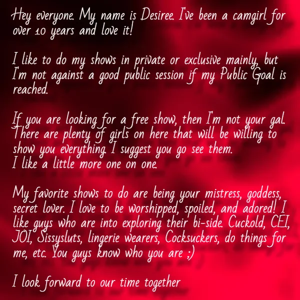 All who want to serve Me are welcome! I am a true Goddess, I will always be your deepest, darkest secret. I love to watch you perform naughty acts for me on C2C. Bring your toys, and cum play with me! Cum stroke and empty your balls to me! Let's have some fun!